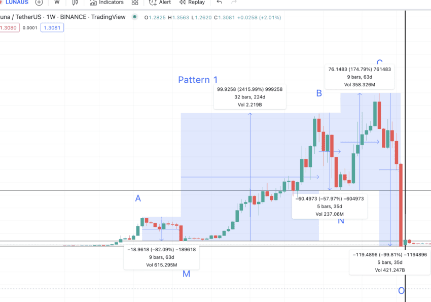 Osservando il grafico settimanale di LUNA, c’è un chiaro schema. Dopo una sessione di trading piatta arriva un picco seguito da un minimo e due picchi più alti, ogni picco è seguito da un minimo, che abbiamo segnato per una migliore comprensione.