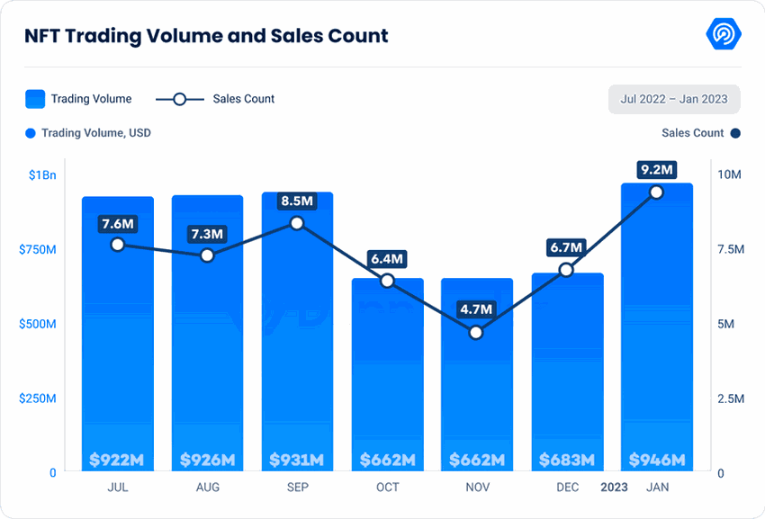 Un’ulteriore crescita è stata registrata nel 2022, come riportato da DappRadar, con il mercato degli NFT che ha raggiunto il volume di scambi più alto dal giugno dello stesso anno. Inoltre, il numero di vendite di NFT è salito alle stelle, registrando un aumento del 42% rispetto al mese precedente e totalizzando 9,2 milioni di vendite. Questa tendenza dimostra che il mercato degli NFT è fiorente e in espansione, a testimonianza di un significativo rimbalzo e di una continua espansione del settore. Nel 2023, questo slancio continuerà, con un fatturato di 1.681,00 milioni di dollari.