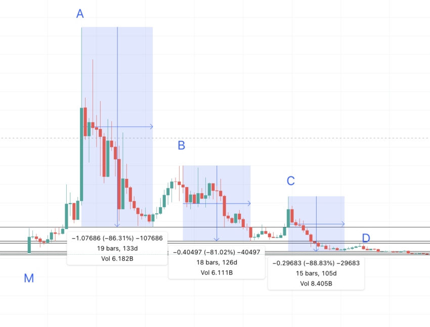 A a N = 133 giorni e -86,38% di variazione del prezzo; B a O = 126 giorni e -81,02% di variazione del prezzo; C a P = 105 giorni e -88,83% di variazione del prezzo.