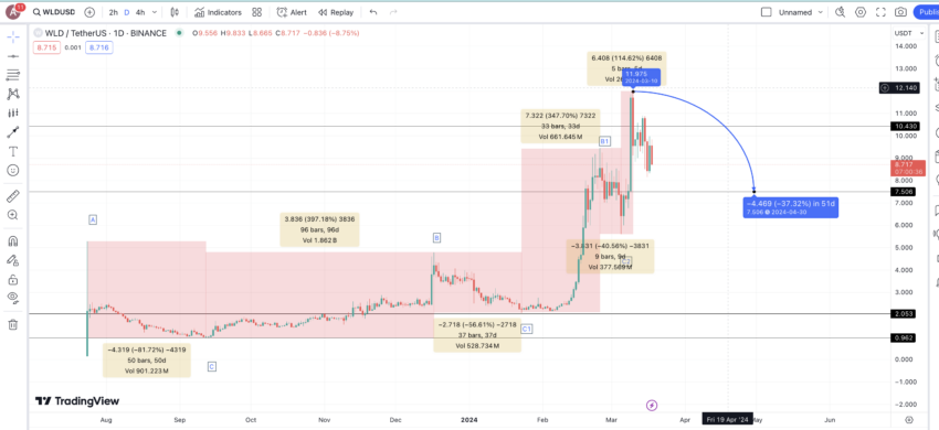 Supponendo che il prossimo calo per WLD si manifesti a 7,50 $, secondo l’analisi di breve periodo, possiamo stabilire i livelli di prezzo previsti per ciascun anno.