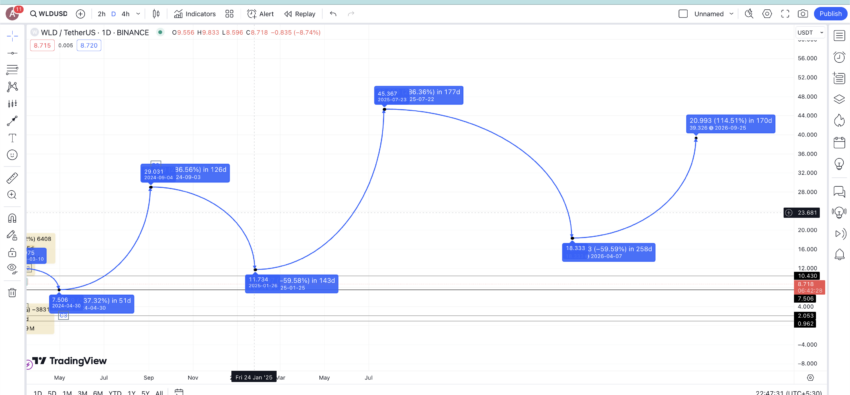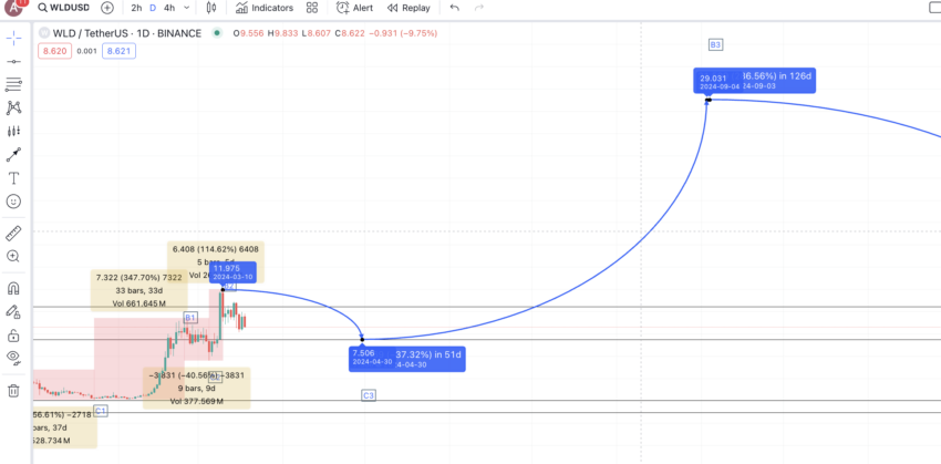 Sulla base dei calcoli precedenti, possiamo anche delineare un possibile minimo per WLD nel 2026, atteso intorno a $18,30 secondo la correzione del 59,63%.
