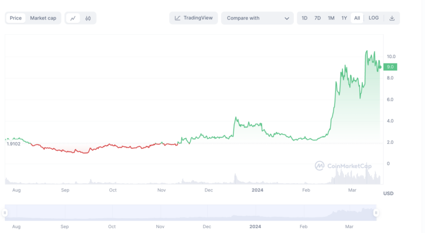 Il 10 marzo 2024, spinto dal rally del mercato crypto, il prezzo di WLD ha superato brevemente la soglia degli $11, registrando un aumento di quasi il 270% in meno di nove mesi. Tuttavia, preoccupazioni di natura geopolitica hanno causato una brusca correzione del prezzo.