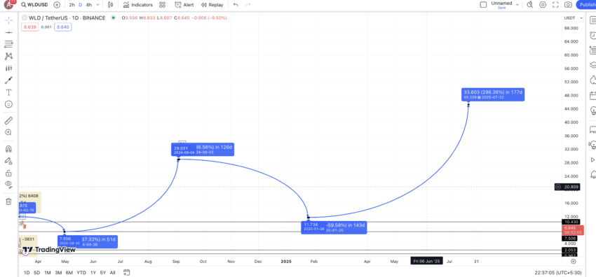 Se stai pensando di mantenere, vendere o persino acquistare WLD nel 2025, è fondamentale osservare da vicino il grafico dei prezzi a breve termine.