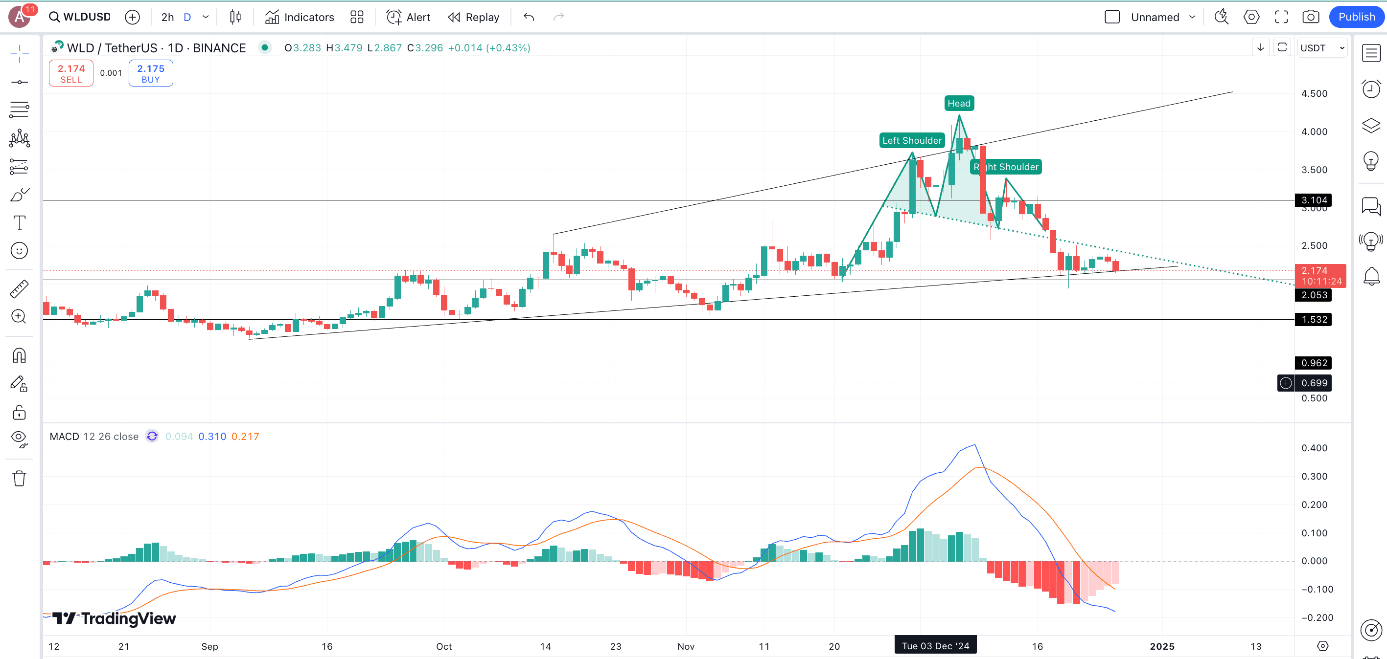 Il grafico giornaliero di WLD mostra ancora segnali ribassisti, poiché la coin ha rotto al di sotto di un pattern “Testa e Spalle” non convenzionale. Attualmente sta scambiando all’interno di un canale ascendente e una rottura sotto i 2 dollari potrebbe spingere il prezzo fino a 1,5 dollari. Tuttavia, un movimento sopra i 3 dollari potrebbe invalidare il trend ribassista.