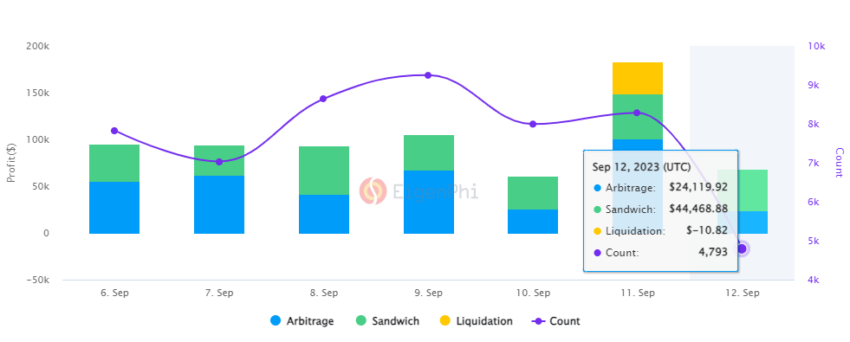 La maggior parte delle operazioni di MEV/ HFT in criptovalute viene effettuata dai ricercatori o dai bot di scambiare. Nel grafico sottostante si può vedere quanto sia redditizio il MEV in cripto.