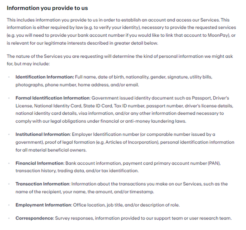 Sì, MoonPay richiede il KYC. È possibile verificare la propria identità su MoonPay utilizzando passaporti, documenti d’identità rilasciati dal governo e altri documenti. MoonPay implementa il KYC per prevenire il riciclaggio di denaro.