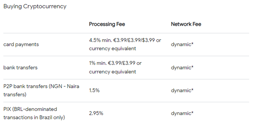 Nel caso delle commissioni, MoonPay ne ha due tipi: commissioni di acquisto e vendita. Le commissioni di acquisto comportano una commissione di elaborazione dipendente dal metodo di pagamento. Per i pagamenti con carta, le commissioni sono le seguenti: