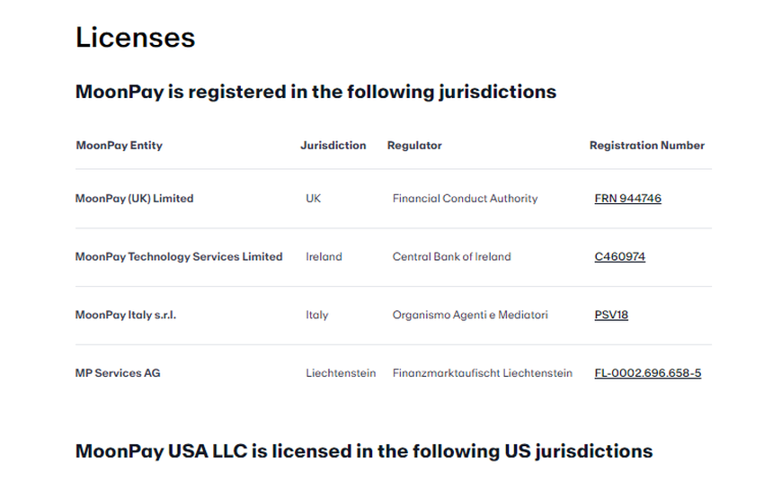 Detiene anche una licenza di cambio valuta a Guam. In Europa, MoonPay detiene licenze nel Regno Unito, Irlanda, Italia e Liechtenstein sotto diverse sussidiarie.