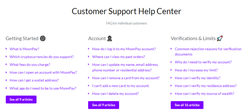 Non ci sono molte informazioni disponibili sul servizio di assistenza clienti di MoonPay. Tuttavia, l’azienda dispone di un centro di assistenza che copre una vasta gamma di scenari per gli utenti. Oltre a questo, non si sa molto sulle procedure e sulle politiche di assistenza clienti di MoonPay.
