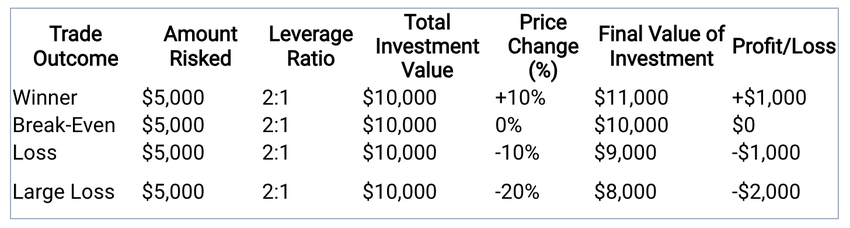 Secondo questa simulazione di Tradeciety, i potenziali risultati dello scambiare a margine con un rapporto di leva 2:1 (2x) sono importanti, con una variazione di prezzo solo del 10%.