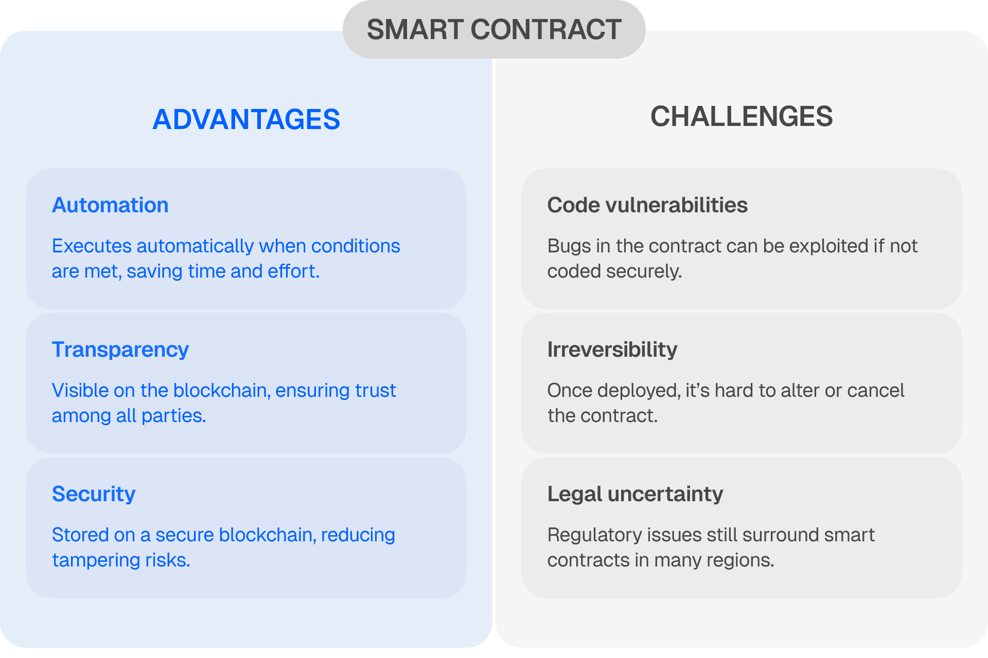 ➤ Questioni legali, di sicurezza e di scalabilità pongono sfide per gli smart contract, ma i miglioramenti in corso stanno affrontando efficacemente queste difficoltà.