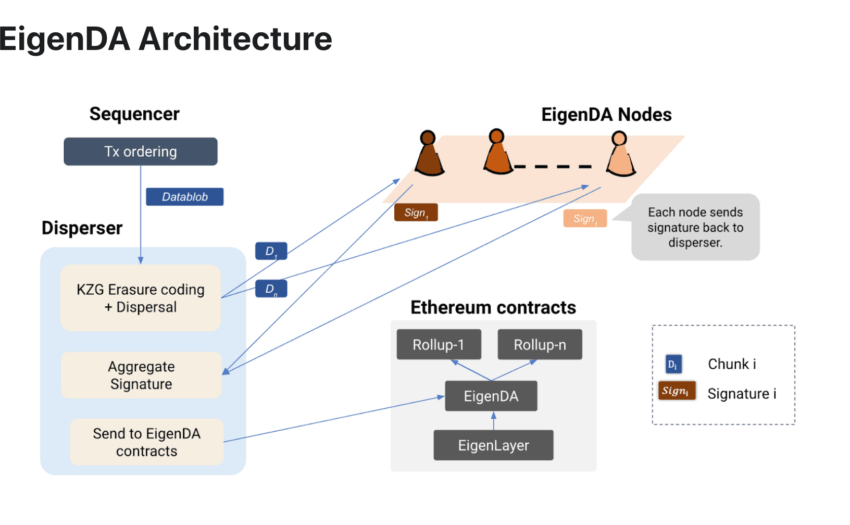 In particolare, EigenDA costituisce il livello di disponibilità di EigenLayer, che comprende anche l’infrastruttura di restaking e l’architettura di base con altri protocolli costruiti sopra di essa.