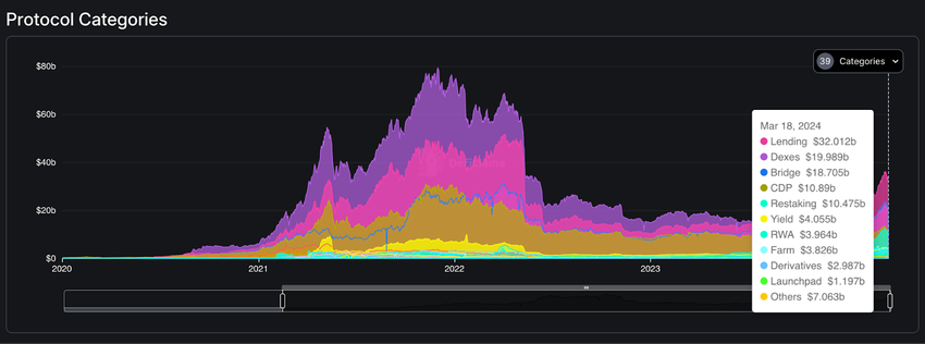 Secondo DeFiLlama, le principali categorie di protocolli sono i prestiti, i DEX, i ricongiunti, i CDP (protocolli che coniano il proprio stablecoin utilizzando prestiti collateralizzati) e il restaking.
