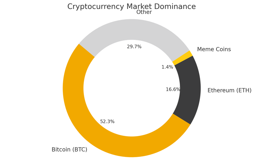 Bitcoin (BTC) ed Ethereum (ETH) continuano a guidare il mercato delle criptovalute, detenendo rispettivamente il 52,3% e il 16,6% della quota di mercato. Nel frattempo, le monete meme stanno emergendo come attori significativi, rappresentando sia i meme che i simboli dei risultati ottenuti dalla comunità nell’arena delle criptovalute.