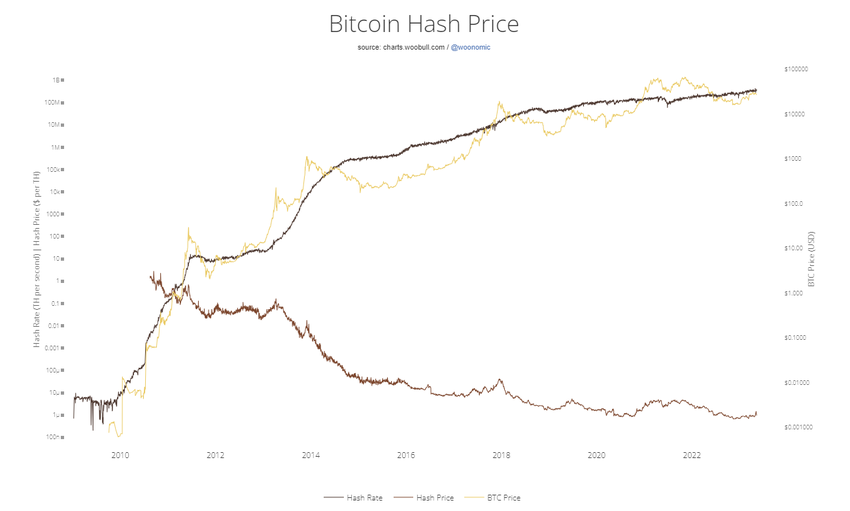 In generale, questo porta a una costante diminuzione del reddito dei minatori. Uno dei più noti analisti on-chain @woonomic esprime questa tendenza con l’indicatore del prezzo dell’hash. Si tratta delle entrate generate dai minatori su base terahash.