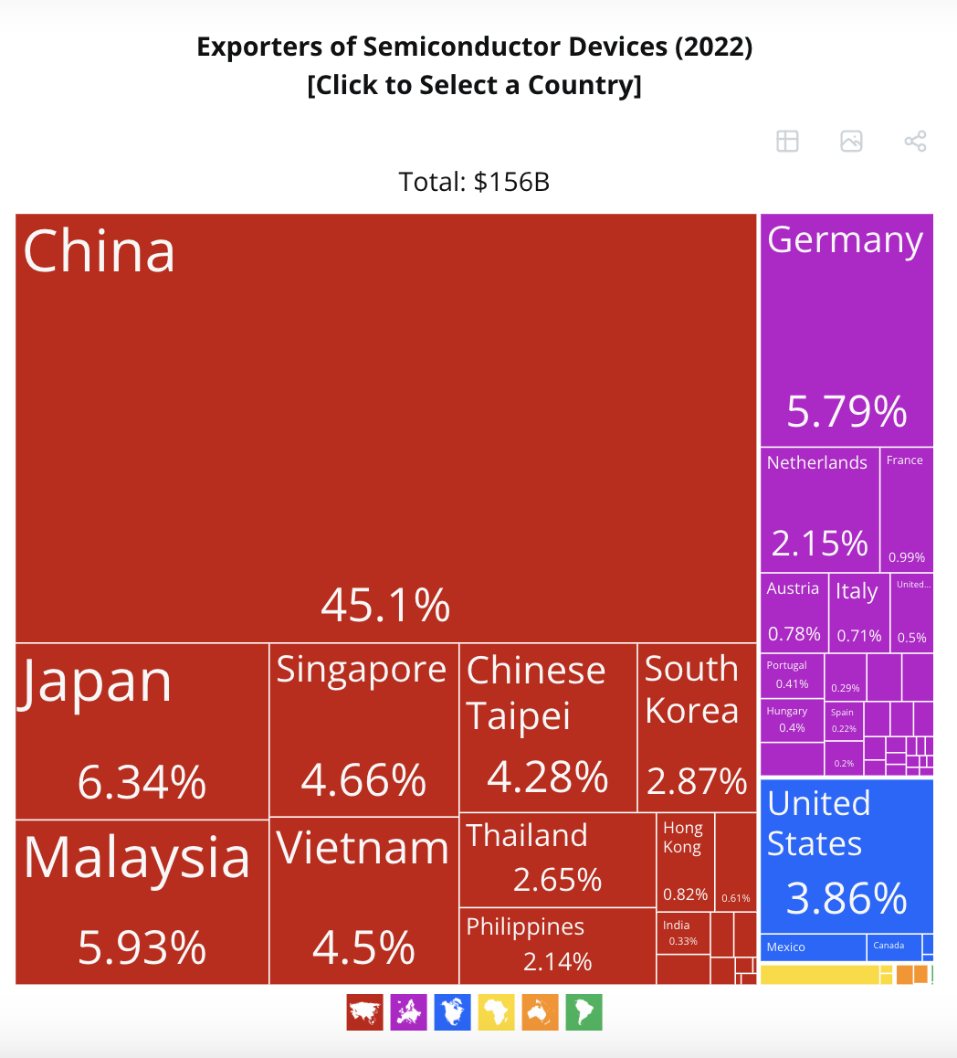 Secondo i dati dell’Osservatorio della Complessità Economica, nel 2022, gli Stati Uniti si sono classificati come il terzo importatore mondiale di dispositivi a semiconduttore, con importazioni per un totale di 16,6 miliardi di dollari. I principali fornitori di queste importazioni erano Vietnam ($4,57 miliardi), Malesia ($2,13 miliardi), Thailandia ($1,66 miliardi), Corea del Sud ($1,54 miliardi) e Cina ($962 milioni).