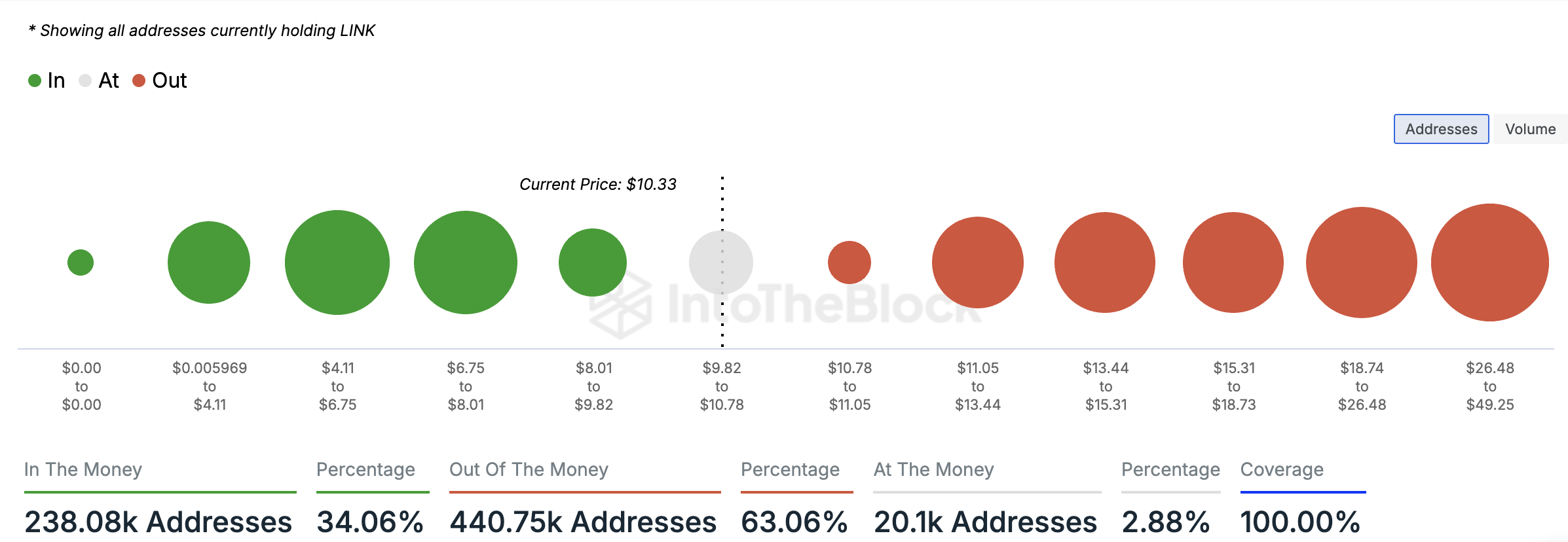 SponsoredCiononostante, un’occhiata alle statistiche finanziarie di LINK rivela che molti dei suoi titolari sono “fuori dal denaro”. Un indirizzo è considerato “out of the money” se il prezzo di mercato attuale di un asset è inferiore al costo medio al quale l’indirizzo ha acquistato (o ricevuto) i token che attualmente detiene.
