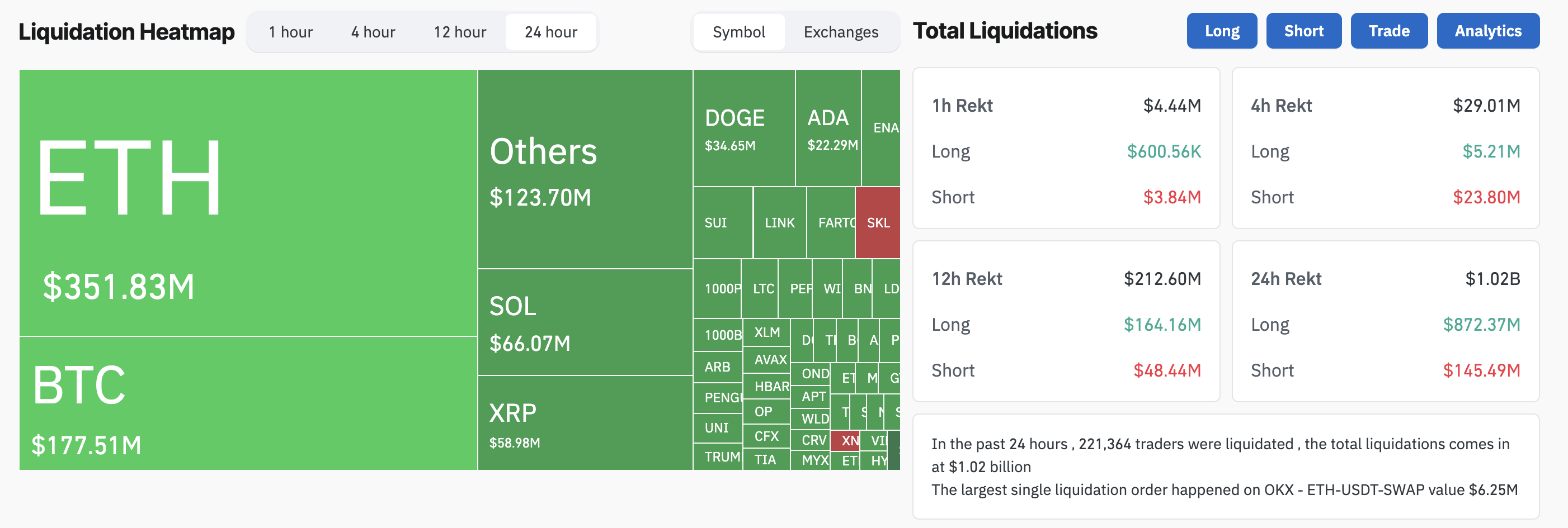 Secondo i dati di Coinglass, $1,02 miliardi in posizioni crypto sono state liquidate in 24 ore, colpendo 221.364 trader. Le posizioni long hanno rappresentato la maggior parte delle perdite, con $872,37 milioni liquidati.