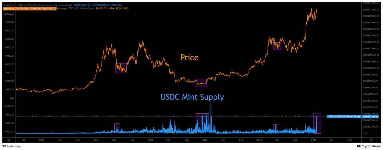 Secondo un nuovo rapporto di CryptoQuant, la liquidità di USDC è al livello più alto da febbraio 2023. Il rapporto ha notato che Circle solitamente conia così tanti token in periodi ribassisti.