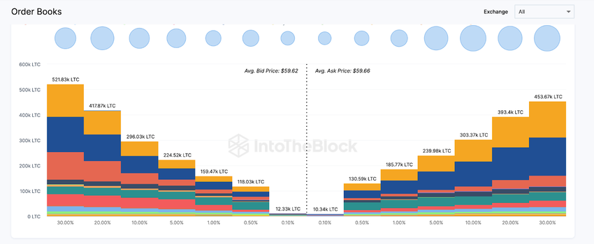 Da una prospettiva on-chain, il muro di supporto del LTC montato al territorio dei 50 dollari durante il crash di FTX rimane ancora saldamente al suo posto. Anche il Market Depth dell’Exchange On-chain, che mostra l’attuale distribuzione dei prezzi degli ordini di acquisto/vendita di Litecoin attivi, afferma questa posizione.