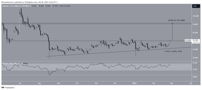 Il prezzo del Litecoin (LTC) ha rimbalzato su una linea di tendenza di supporto ascendente a lungo termine e sta uscendo da un modello rialzista a breve termine.