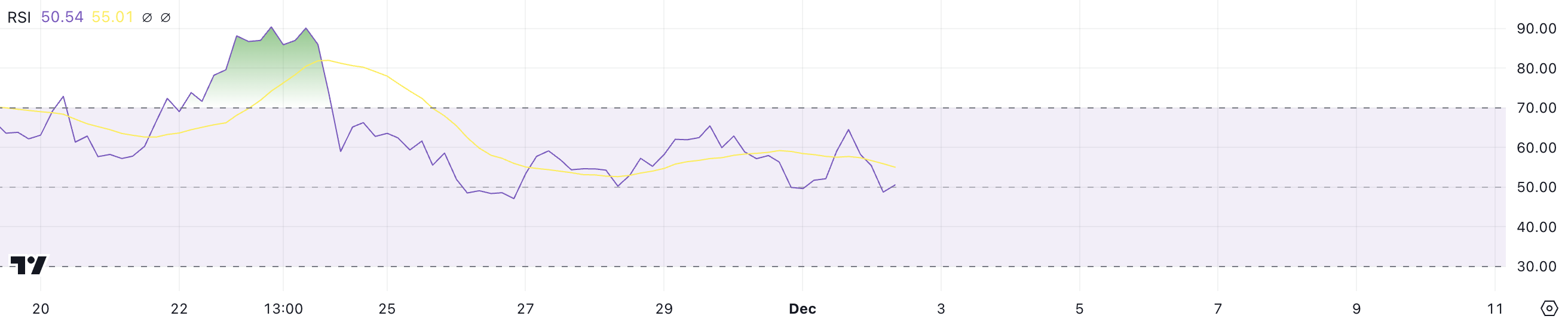 Stellar RSI attualmente si trova a 50,5, in calo da 64 solo un giorno prima. Tra il 21 novembre e il 24 novembre, l’RSI è rimasto sopra 70, coincidente con il prezzo di XLM che ha raggiunto il suo livello più alto da maggio 2021.