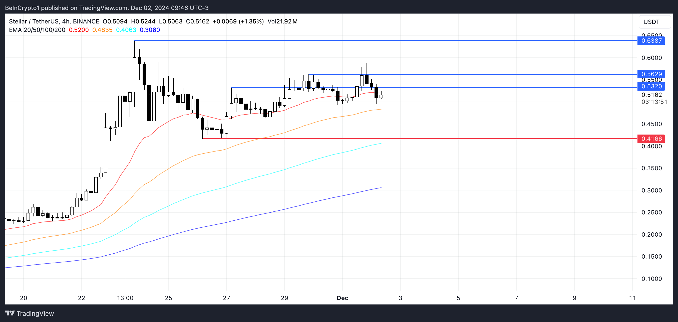 Attualmente XLM affronta due resistenze vicine a 0,53 USD e 0,56 USD, mentre le sue linee EMA rimangono rialziste, con medie a breve termine sopra quelle a lungo termine.