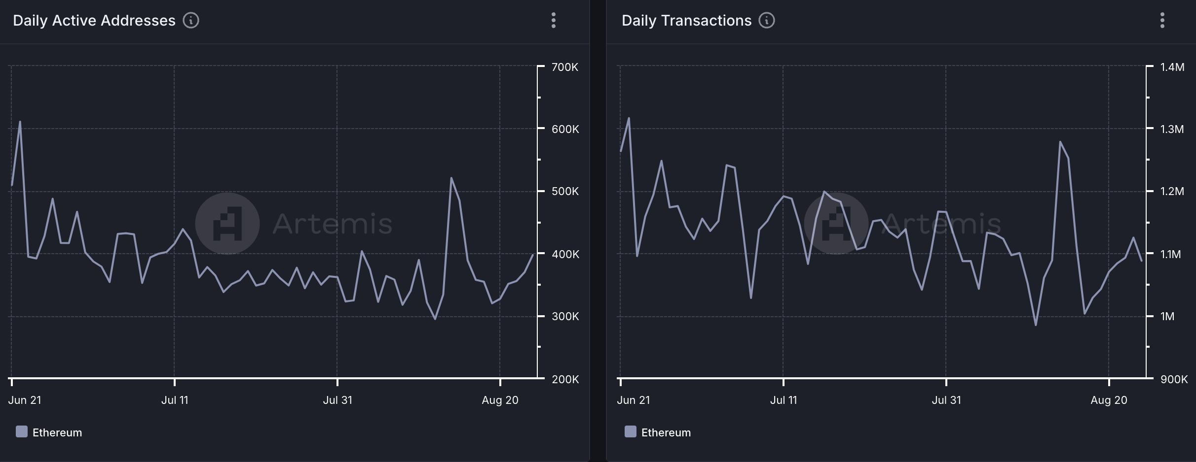 Negli ultimi mesi l’attività degli utenti di Ethereum ha avuto una tendenza al ribasso. I dati di Artemis rivelano che da quando gli indirizzi attivi giornalieri hanno piccato a 611.000 il 22 giugno, il numero di utenti su Ethereum è diminuito del 37%.