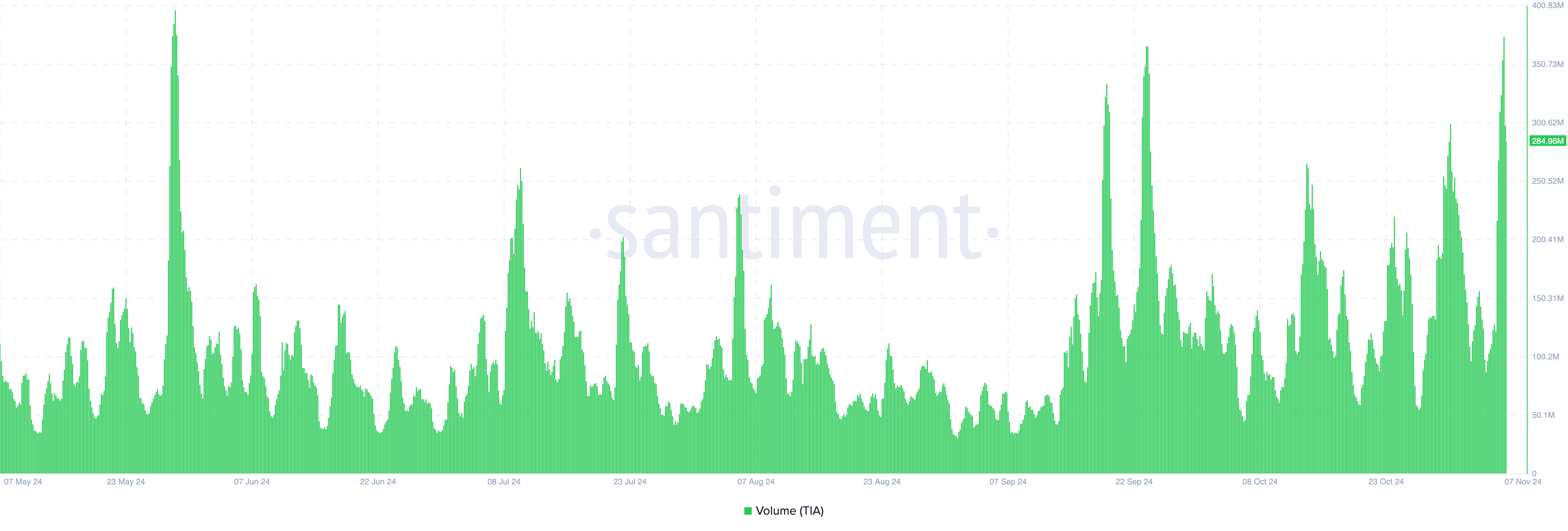 Secondo Santiment, il volume di TIA è salito sopra i 350 milioni di USD oggi. Anche se è leggermente diminuito al momento della stampa, è notevolmente più alto rispetto ai valori raggiunti nei giorni precedenti di novembre.