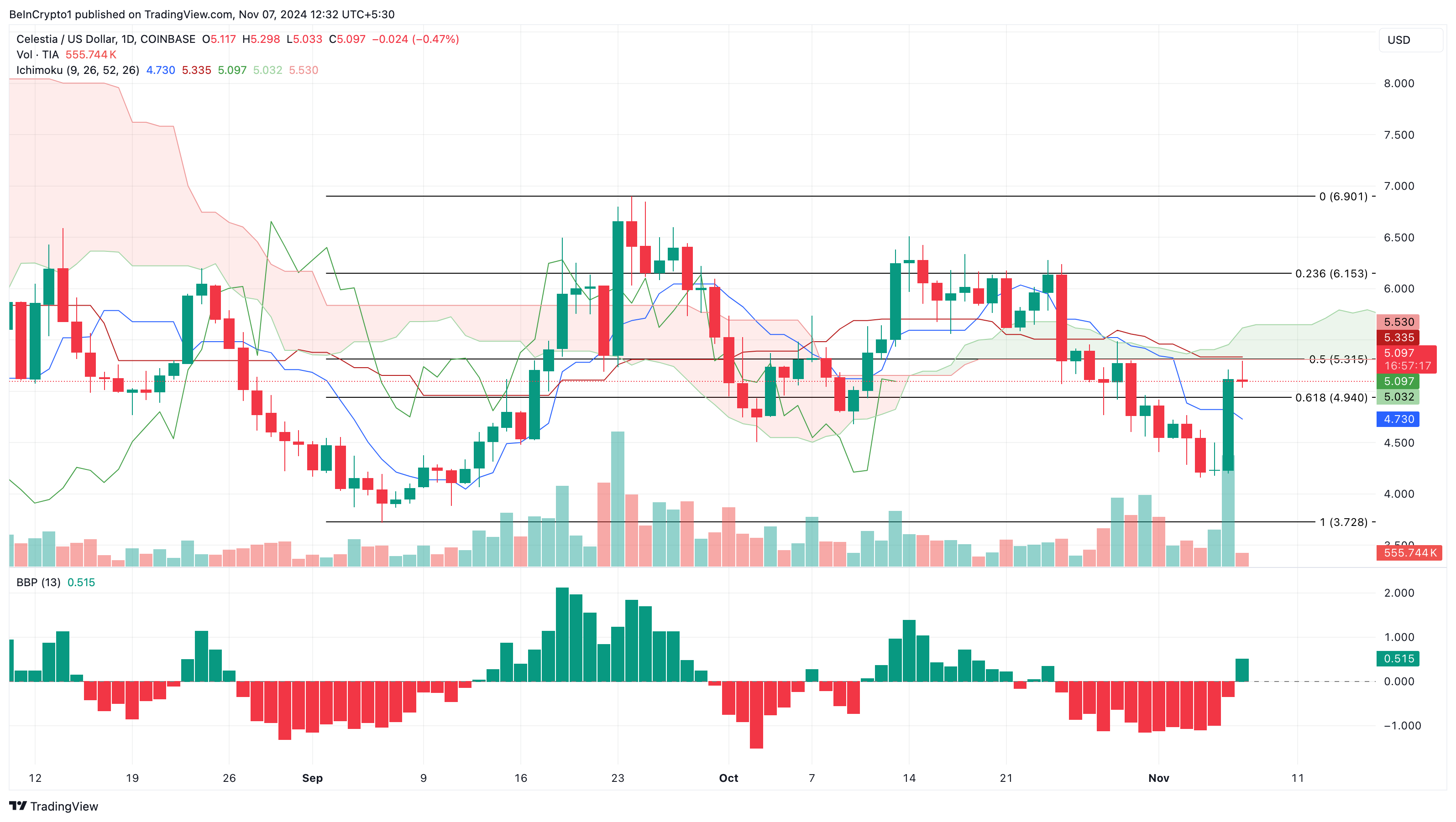 Nel grafico giornaliero, Celestia si avvicina a un livello tecnico chiave, poiché il prezzo è sul punto di superare la Ichimoku Cloud. La Ichimoku Cloud è un potente indicatore usato per valutare la direzione generale del trend e i potenziali livelli di supporto e resistenza.