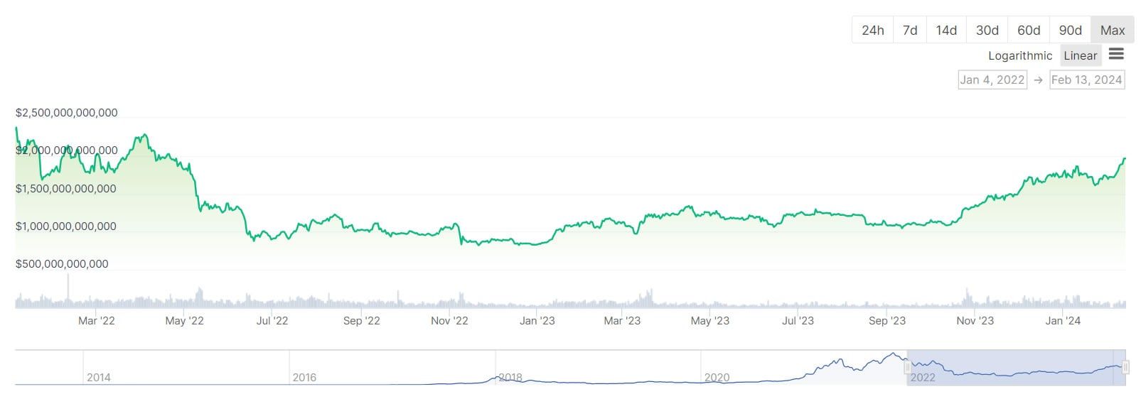 La capitalizzazione del mercato delle criptovalute è a 1,97 trilioni di dollari, il livello più alto dall’aprile 2022, quando le cose sembravano molto diverse.