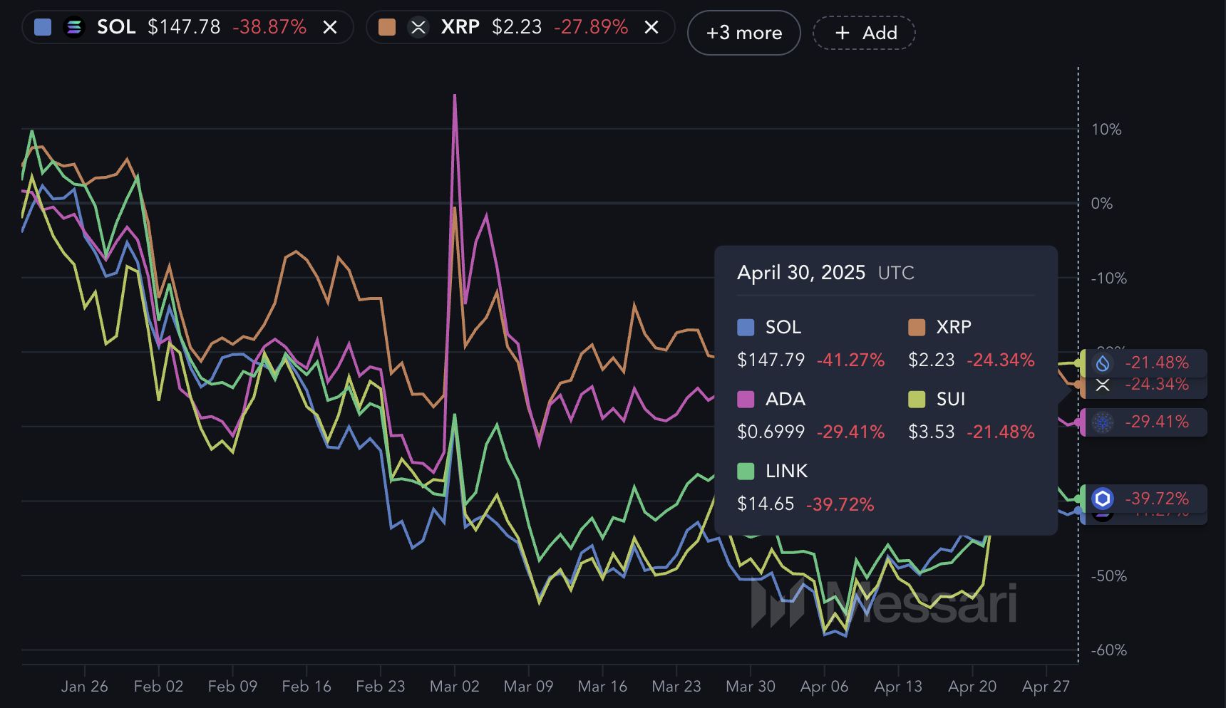 ADA, LINK e XRP hanno registrato guadagni modesti tra il 7% e il 10% nell’ultimo mese, ma rimangono in calo di oltre il 24% nei primi 100 giorni dell’amministrazione.