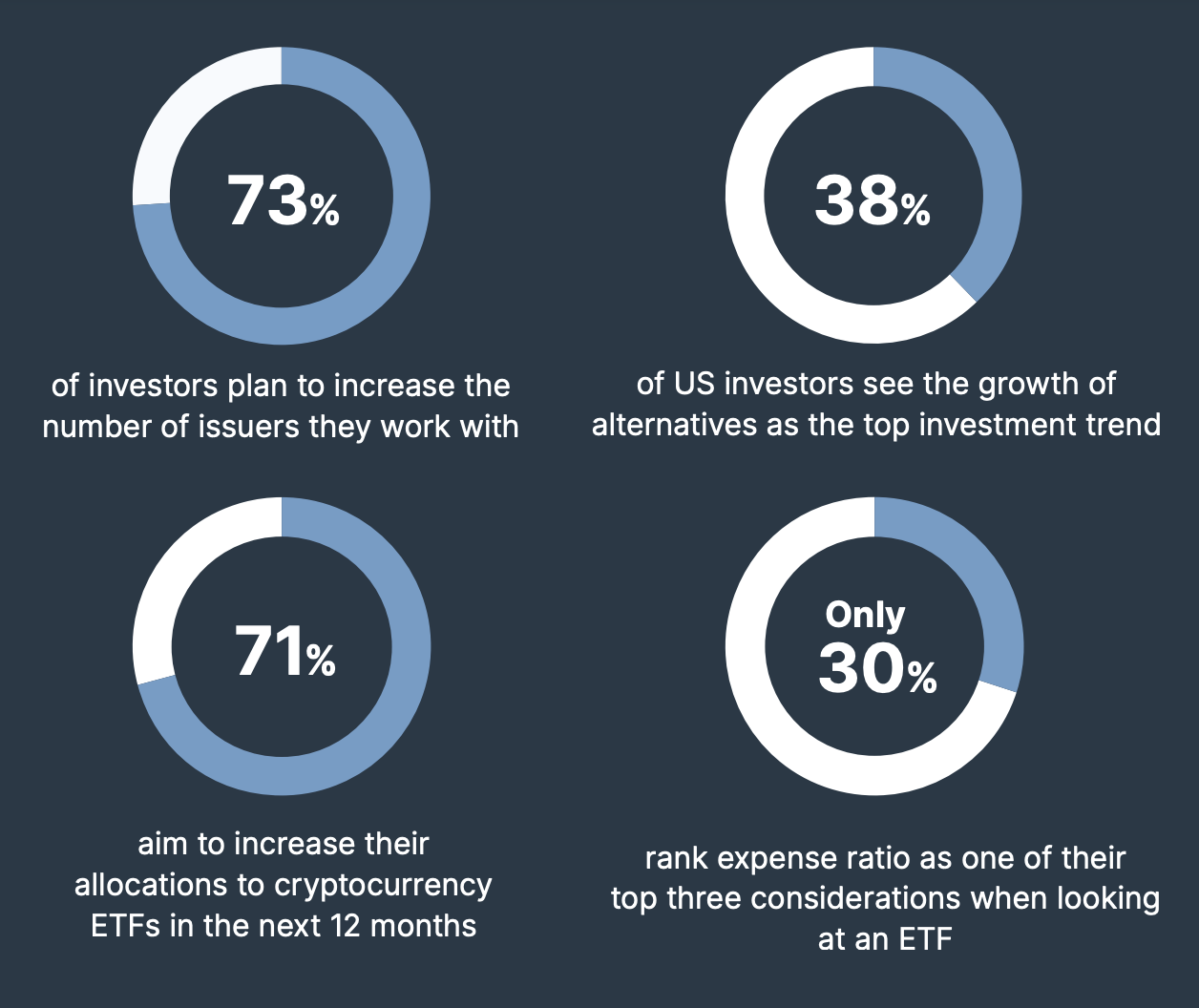 “Buone notizie per il pubblico crypto, il 71% [degli investitori intervistati] ha dichiarato di voler aumentare la propria allocazione agli ETF crypto nei prossimi 12 mesi. È più di quanto avrei pensato, avrei ipotizzato il 40-50% e sono piuttosto ottimista su questo settore, relativamente parlando,” ha affermato Eric Balchunas, un noto analista di ETF.