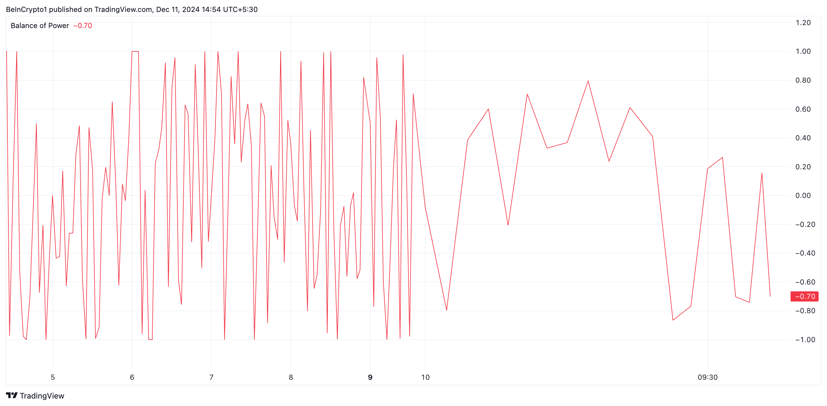 SponsoredLa valutazione di BeinCrypto del grafico orario ME/USD conferma l’aumento dei sentimenti ribassisti verso l’altcoin. Questo è riflesso dal suo indicatore Balance of Power, il cui valore è sotto zero a -0.70 al momento della stampa.