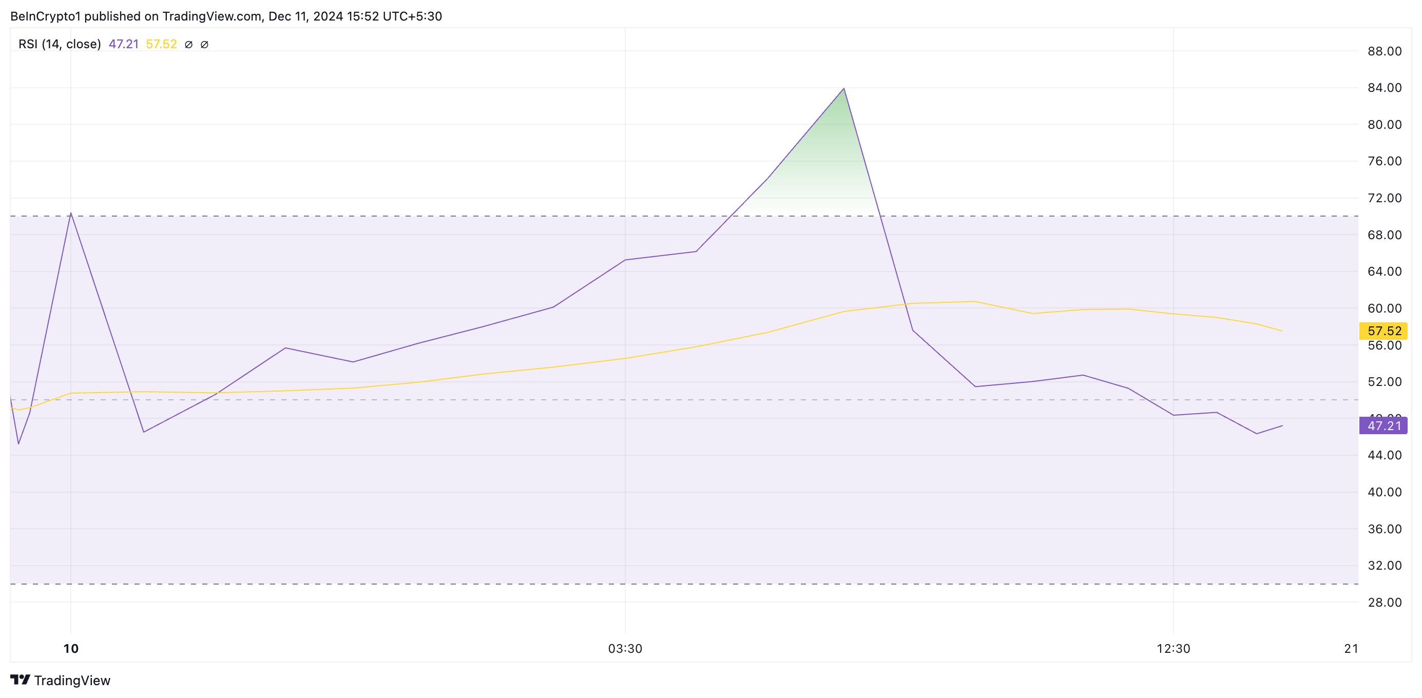 L’indicatore RSI misura le condizioni di mercato di ipercomprato e ipervenduto di un asset. Varia tra 0 e 100, con valori superiori a 70 che suggeriscono che l’asset è ipercomprato e necessita di una correzione.