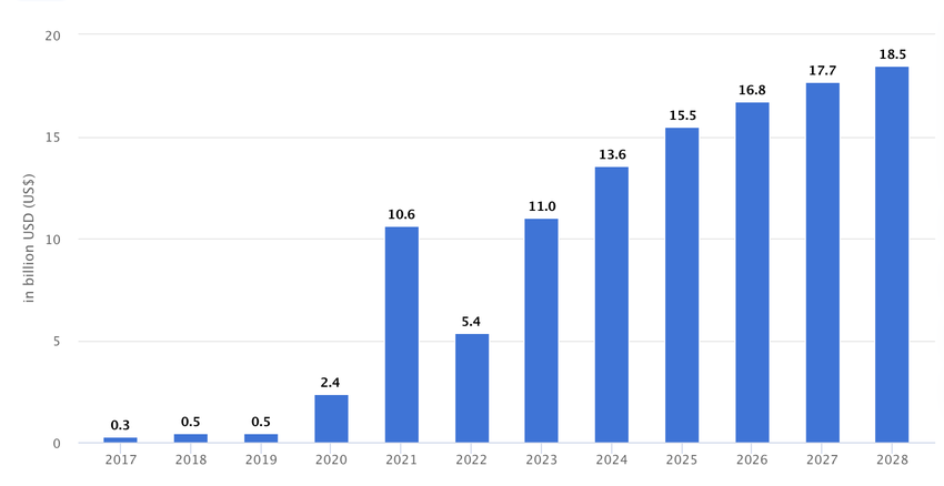 Statista prevede che il fatturato delle criptovalute in Europa raggiungerà i 18,5 miliardi di dollari entro il 2028.