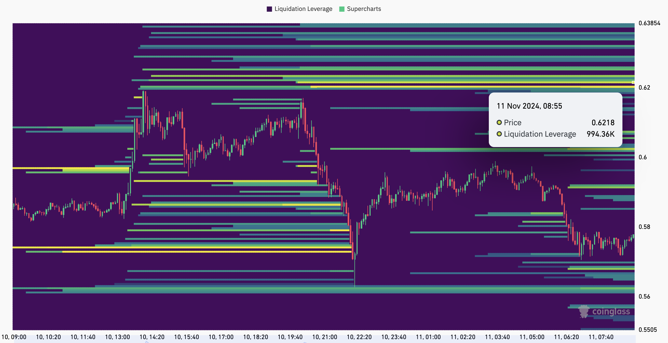 Secondo Coinglass, XRP ha diversi livelli di prezzo e molta liquidità, ma il più notevole è intorno a 0,62 USD. Come si vede sotto, il colore della mappa di liquidazione di XRP è cambiato da viola a un chiaro giallo a quel livello.