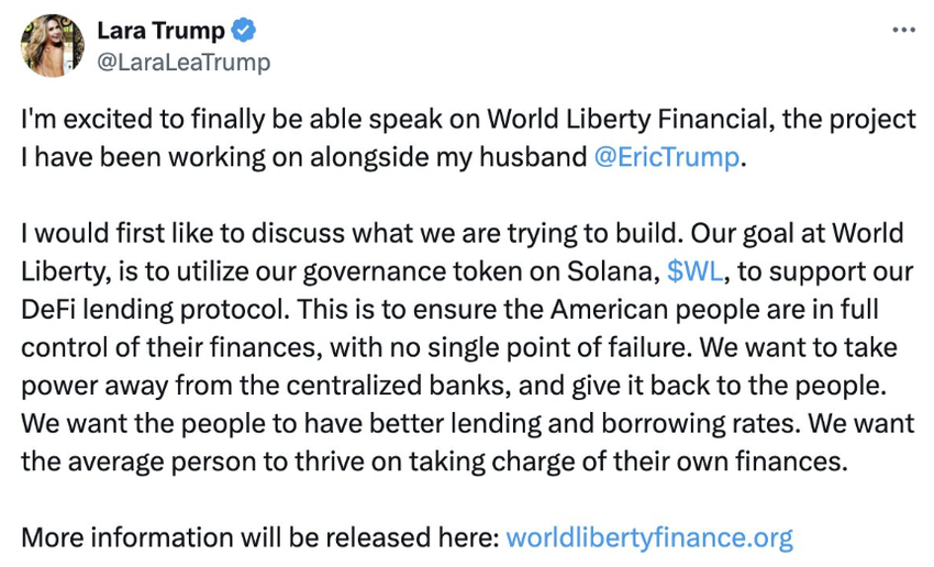 L’hacker ha compromesso l’account di Lara Trump intorno alle 20:15 ET, usando il profilo della co-presidente del Comitato Nazionale Repubblicano per promuovere il lancio di World Liberty Financial. Il post includeva link che pubblicizzavano una moneta e un sito web che si dichiarava l’unico canale ufficiale di World Liberty Financial.
