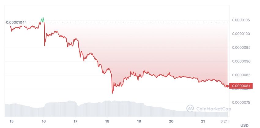 Shiba Inu continua a registrare candele rosse, crollando di un altro 3,5% nelle ultime 24 ore. La quotazione di $SHIB è ora di 0,0000081 dollari, in calo del 23% nell’ultima settimana, con una capitalizzazione di mercato di soli 4,7 miliardi di dollari.