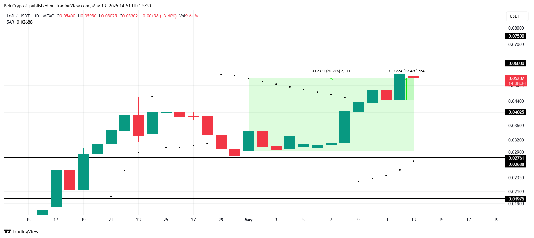 Dall’inizio del mese, LOFI ha visto un aumento dell’81%, attualmente scambiata a $0,0530. L’altcoin sta affrontando una resistenza a $0,0600. I punti del Parabolic SAR sotto le candele suggeriscono che lo slancio rialzista potrebbe persistere, potenzialmente spingendo LOFI verso $0,0750 se supera la resistenza.