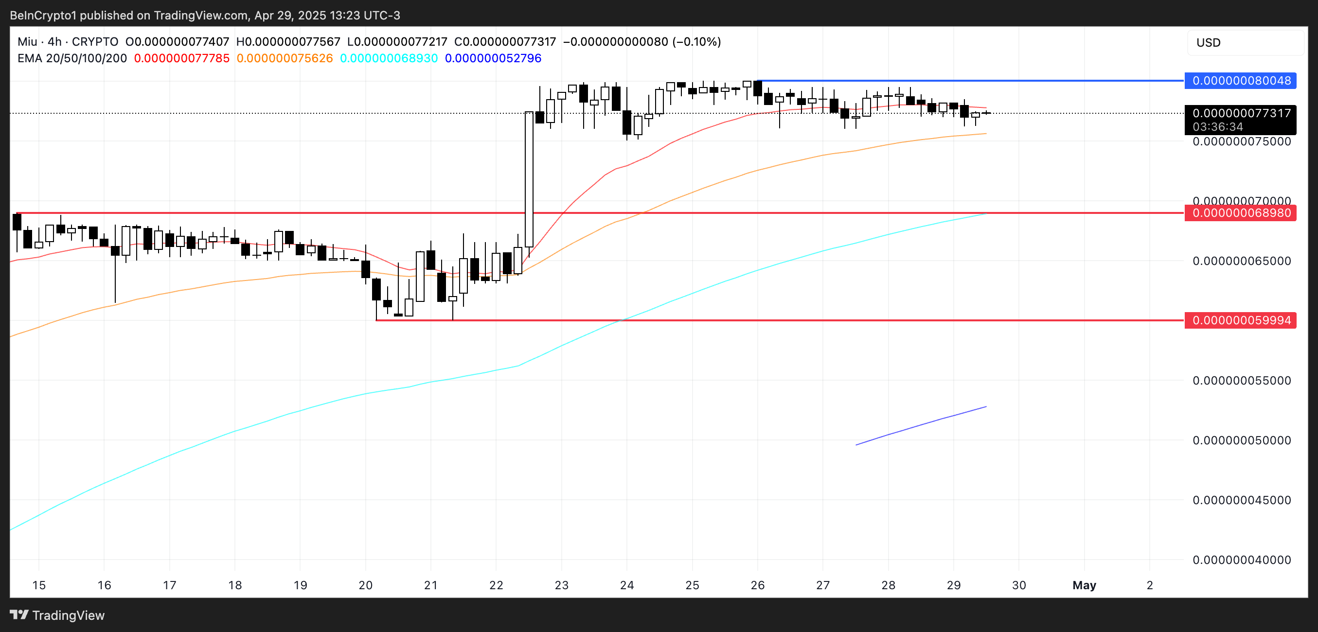 Se il momentum positivo intorno a MIU continuasse, il token potrebbe aumentare per testare il livello di $0,000000080, segnando un nuovo obiettivo a breve termine.