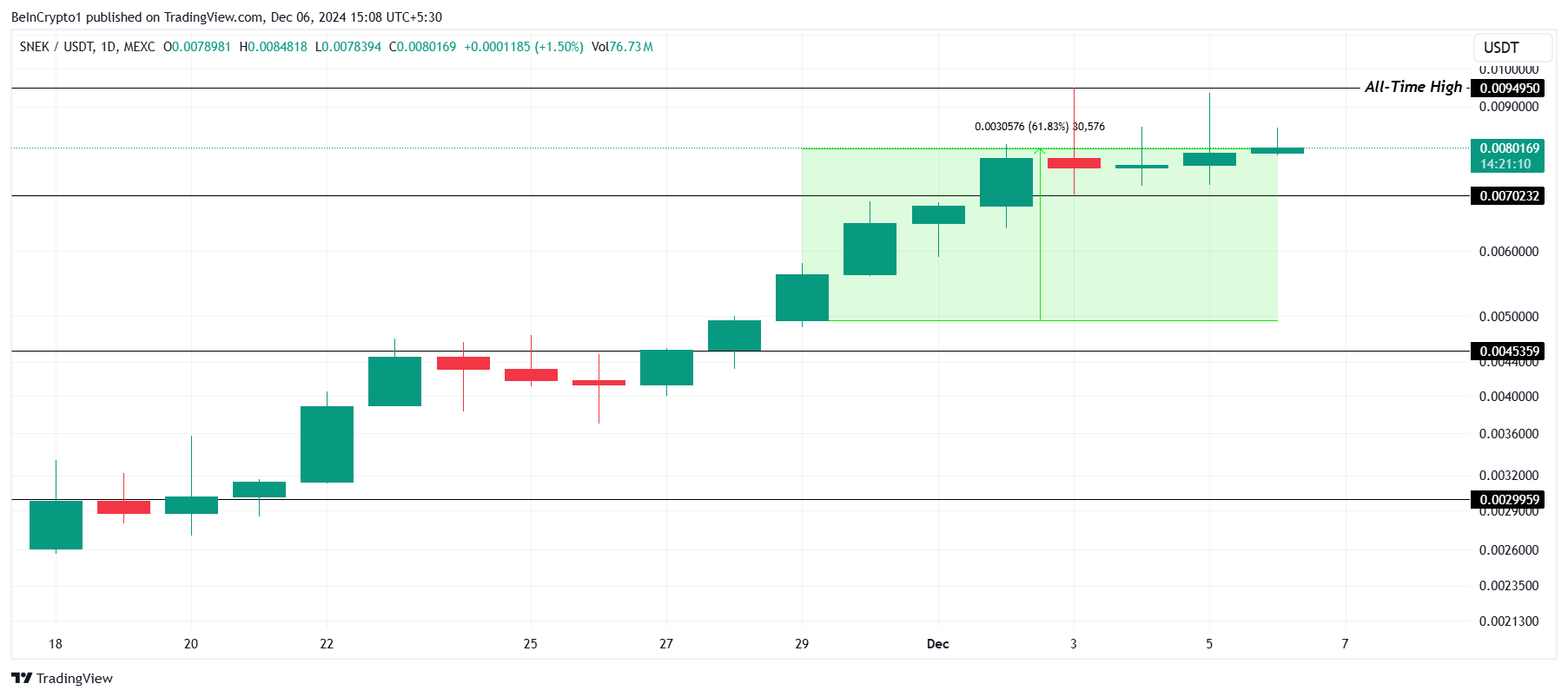 Come MOG, SNEK ha raggiunto un nuovo massimo storico di 0.0094 USD questa settimana, segnalando un forte interesse degli investitori. Al momento della scrittura, la moneta si mantiene sopra il suo livello di supporto di 0.0070 USD. Mantenere questo supporto sarà cruciale per sostenere il recente trend rialzista e continuare il rally verso obiettivi più alti.