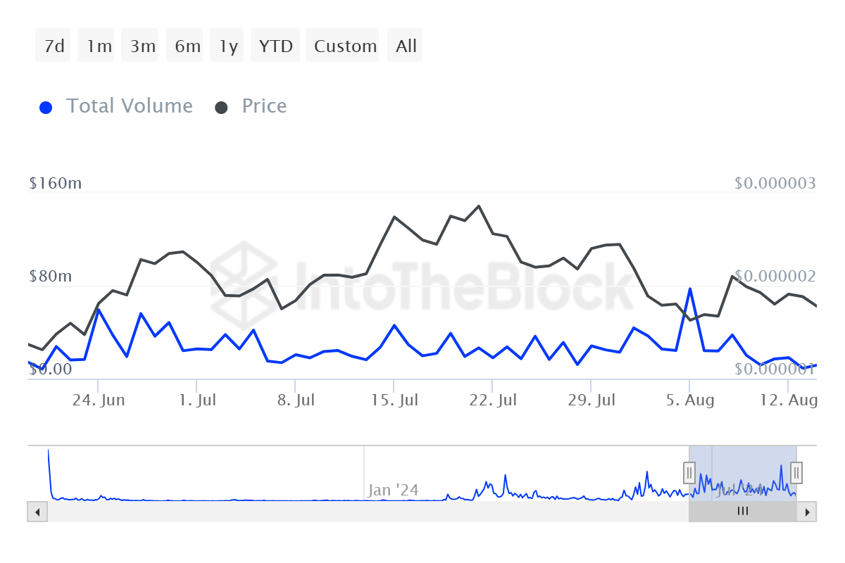 Un’impennata della metrica è un segno positivo, mentre un calo della stessa indica che il progetto sta perdendo trazione sul mercato. Questo potrebbe avere un impatto negativo sull’azione del prezzo, favorendo un ulteriore declino della quotazione della memecoin.