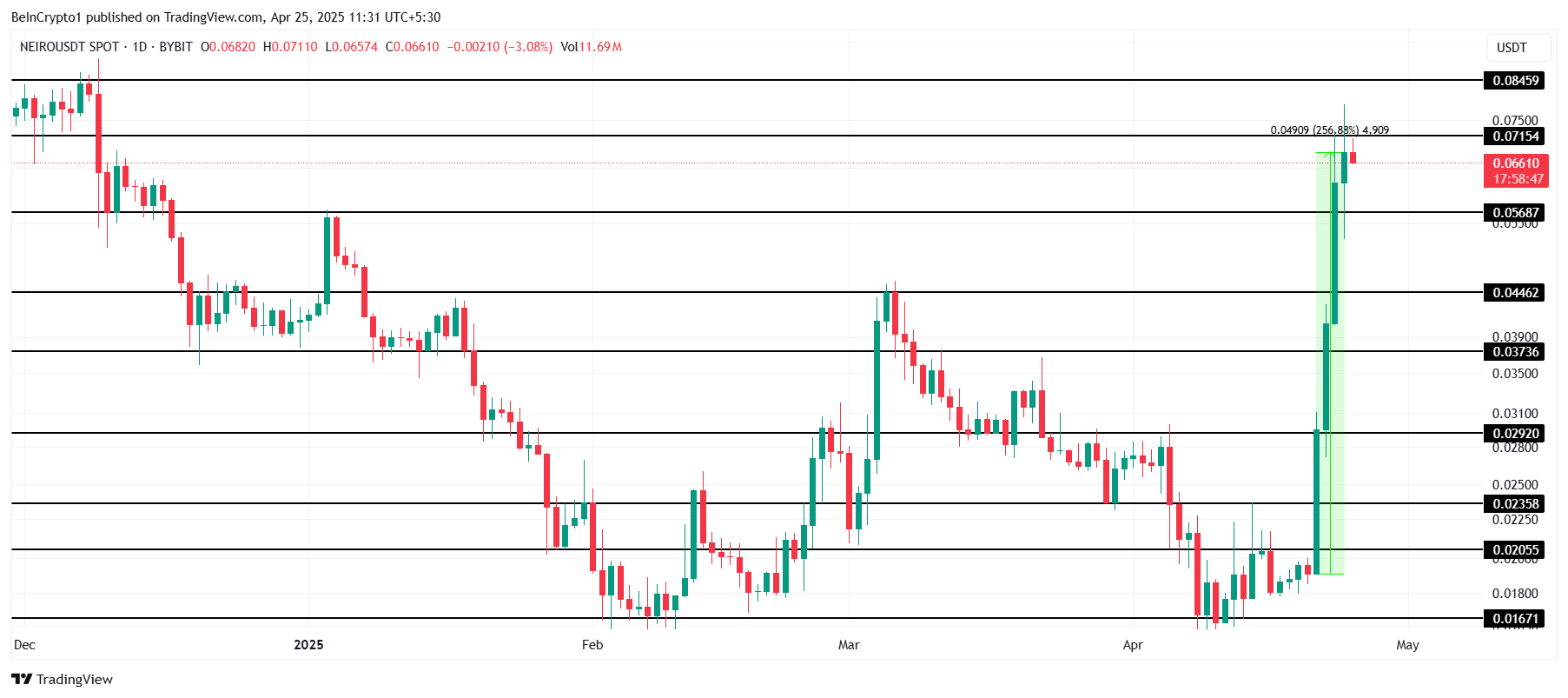 Il potenziale per NEIRO di superare $0,0715 è forte, con il mercato generale che mostra tendenze rialziste mentre Bitcoin si avvicina a $100.000. Questo potrebbe fornire lo slancio necessario per spingere NEIRO verso la resistenza di $0,0845. Un test riuscito di questo livello consoliderebbe i guadagni recenti e preparerebbe il terreno per un movimento verso $0,1000.