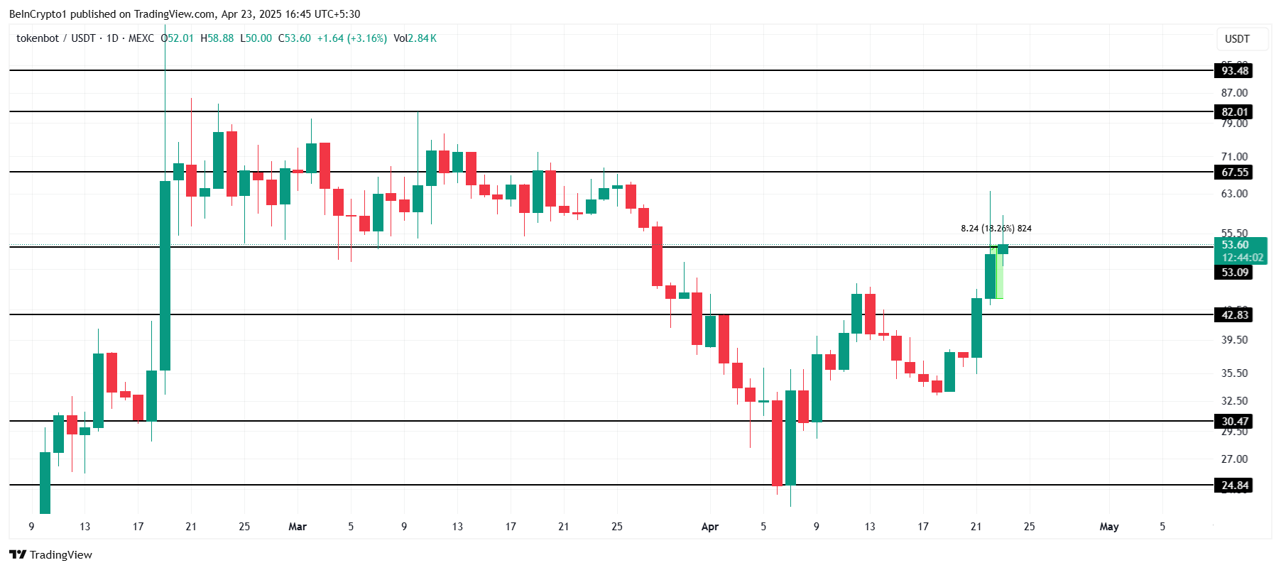 CLANKER ha registrato un aumento significativo del 18% nelle ultime 24 ore, dopo un incremento del 58% negli ultimi cinque giorni. Attualmente scambiata a $53, l’altcoin mostra un forte slancio ed è probabile che continui il suo trend rialzista poiché il sentiment del mercato rimane positivo.
