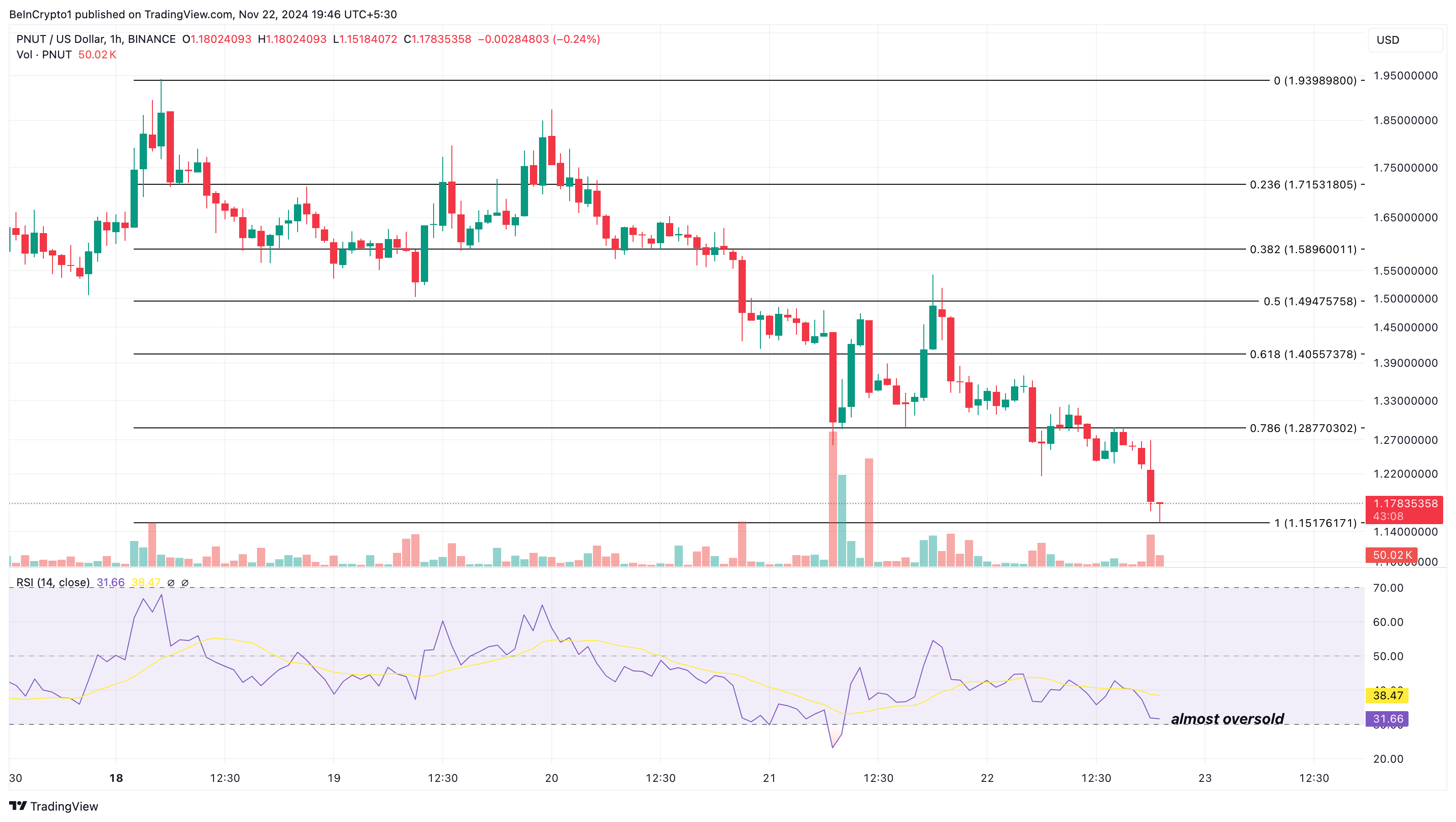 Attualmente, il prezzo di PNUT è di 1,17 USD. Tuttavia, il grafico orario mostra che l’Indice di Forza Relativa (RSI) è sceso a 31,66. Quando l’RSI sale a 70,00, significa che l’asset è ipercomprato.