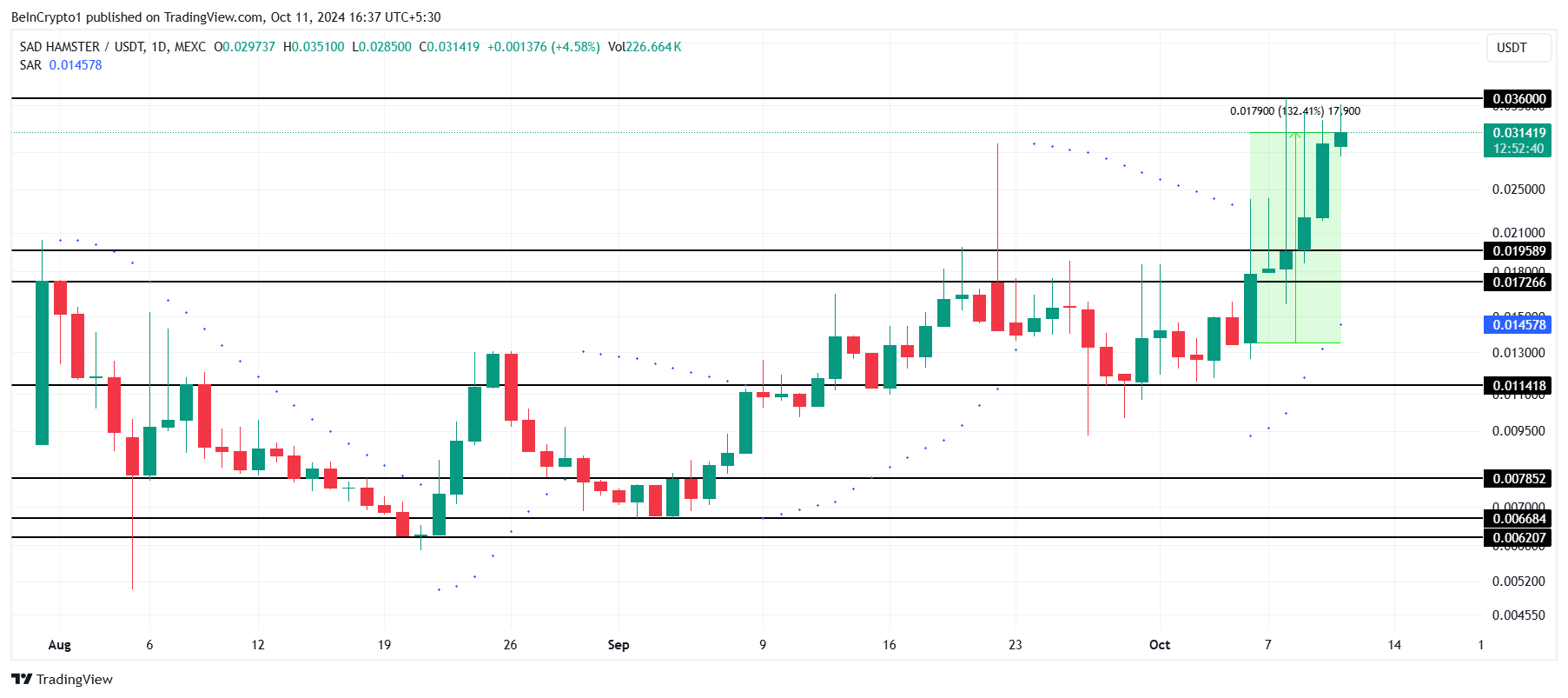 Il memecoin ora punta a 0,0360 USD, che potrebbe innescare ulteriori guadagni se superato. Tuttavia, il mancato superamento di questa resistenza potrebbe innescare pressioni di vendita, portando potenzialmente il prezzo di Sad Hamster a 0,0195 USD.