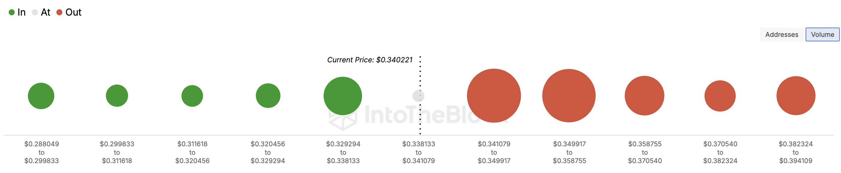 Secondo BeInCrypto, oltre 260.000 indirizzi Cardano hanno acquisito 6,68 miliardi di ADA nel range di 0,34 USD a 0,36 USD. A un prezzo medio di 0,34 USD, questi possedimenti valgono circa 2,77 miliardi di USD, rendendoli più sostanziali rispetto agli indirizzi attualmente in profitto.