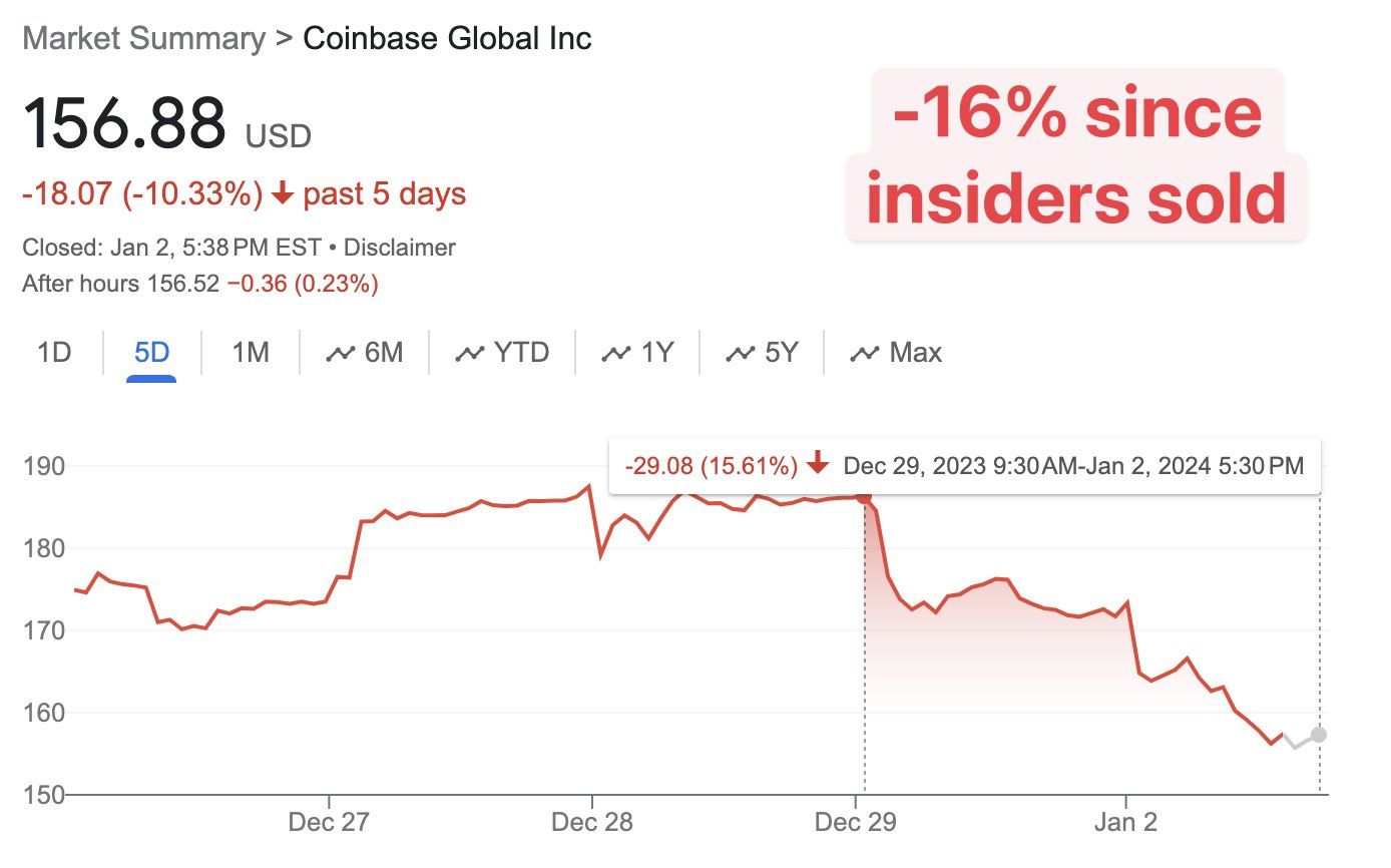 Secondo “Insider Tracker”, che tiene traccia degli scambi azionari di amministratori delegati, dirigenti e membri del Congresso, anche gli insider di Coinbase hanno scaricato le azioni della società.