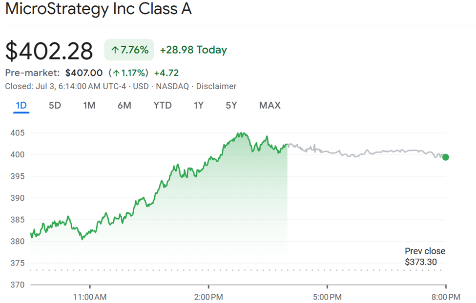 Il prezzo delle azioni MSTR era scambiato a $407 nel pre-market di giovedì, estendendo il rally di mercoledì che ha visto le azioni chiudere con un aumento del 7,76% a $402,28.